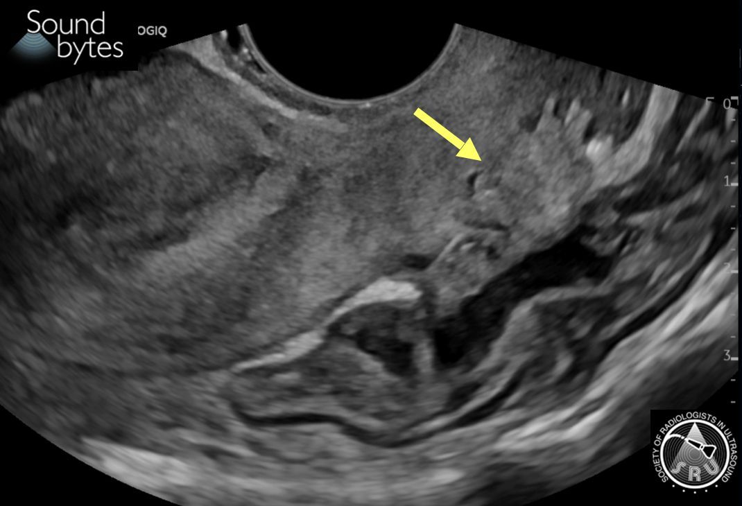 Findings: Iso to hypoechoic mass in the deep cul de sac, adherent to uterine serosa and invading rectal wall.
